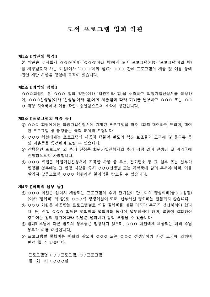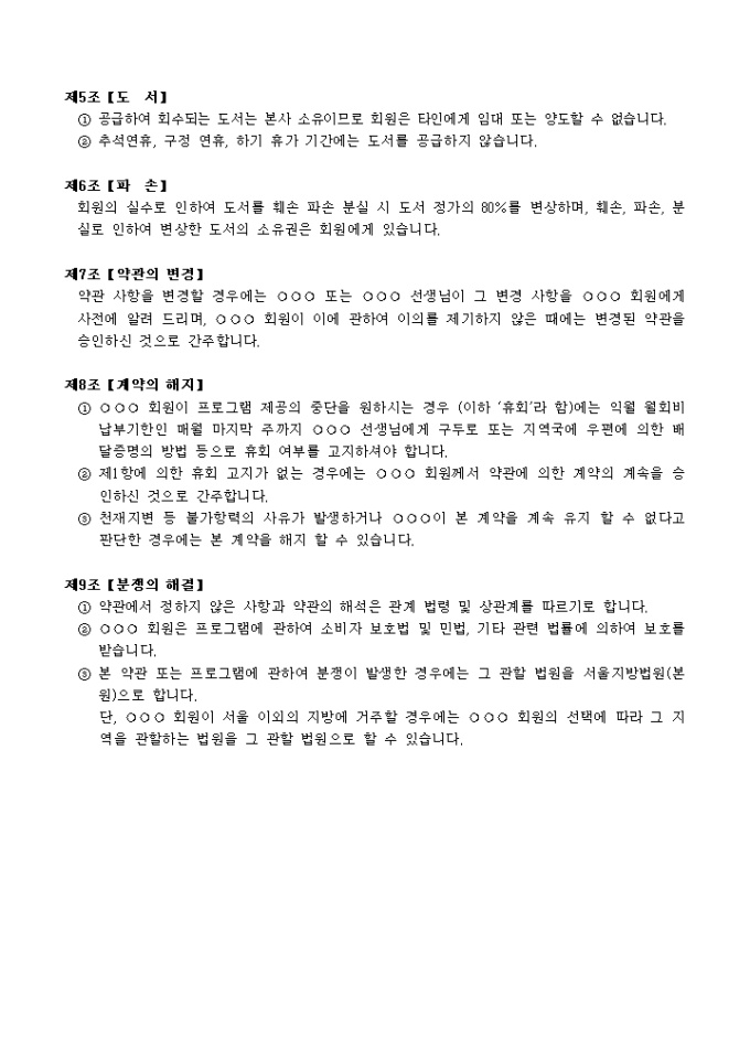약관의 목적, 계약의 성립, 프로그램의 제공 등 9개 조항으로 구성되어있는 약관 샘플입니다.