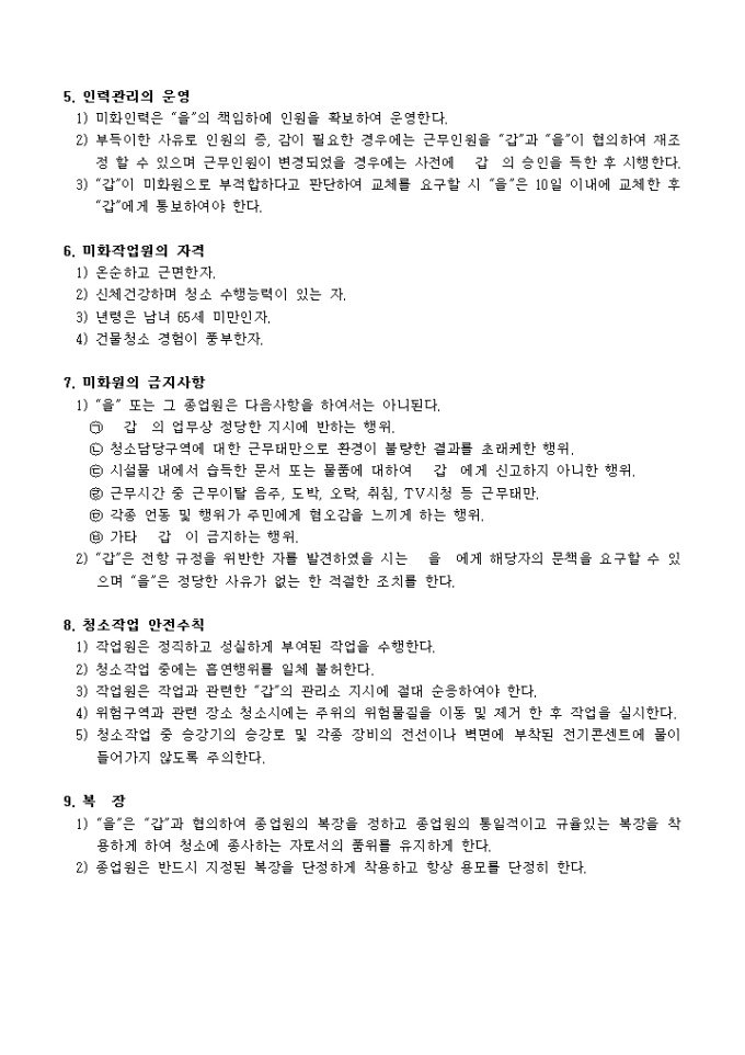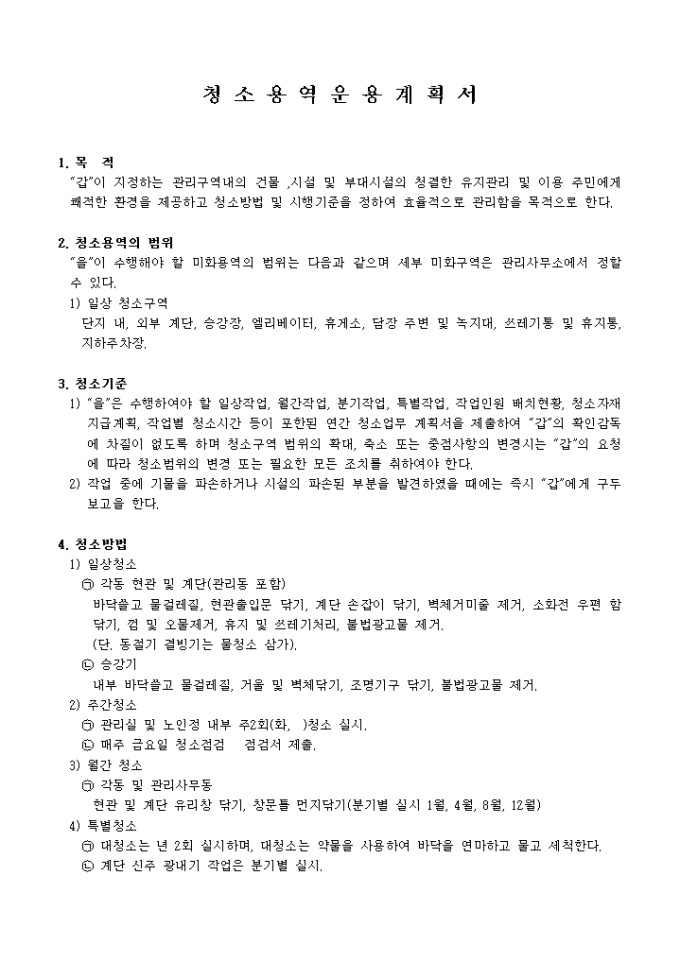 9,000원/월목적, 청소용역의 범위, 청소기준, 청소방법 등의 항목으로 구성되어있는 청소용역운용계획서입니다.