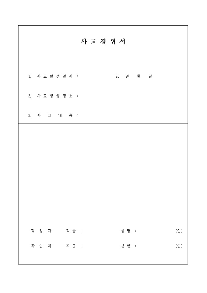 9,000원/월사고발생일시, 사고발생장소, 사고내용 등의 항목으로 구성되어있는 사고경위서입니다.