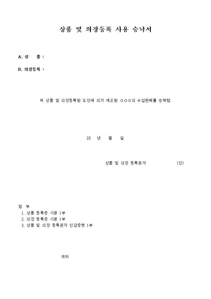 상품 및 의장등록 사용승낙서