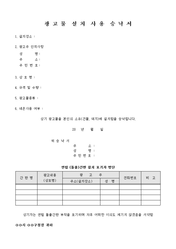 9,000원/월공고물을 소유 건물, 대지에 설치함을 승낙하는 내용의 광고물 설치사용승낙서입니다.