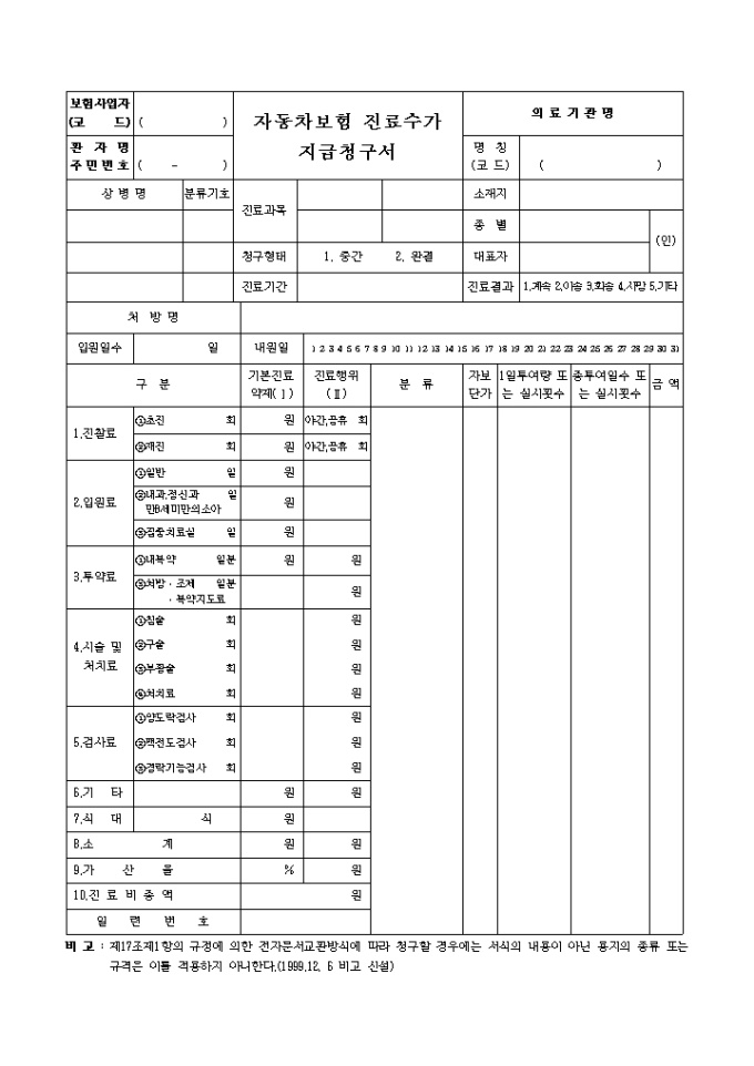 진찰료, 입원료, 투약료 등의 항목으로 구성되어있는 자동차보험 진료수가 지급청구서(외래) 양식입니다.