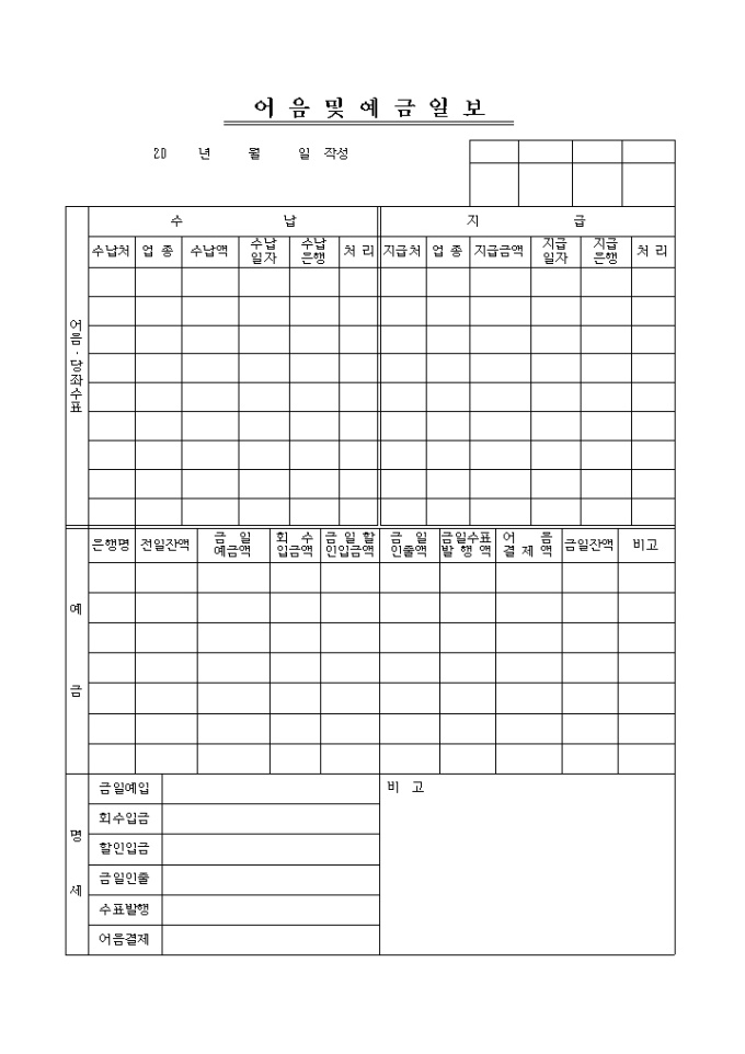 9,000원/월어음의 수납,지급과 현금 입금액,잔고 등을 알 수 있는 양식입니다.