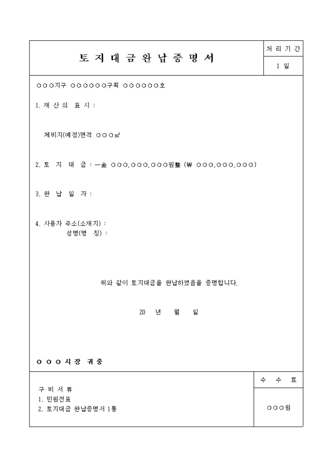 토지대금완납 증명서