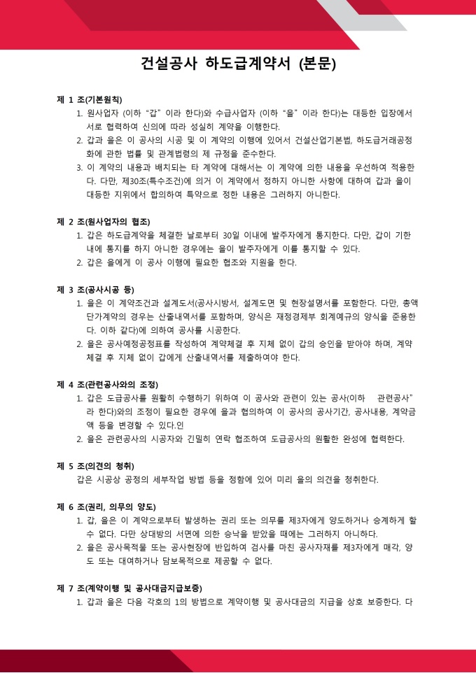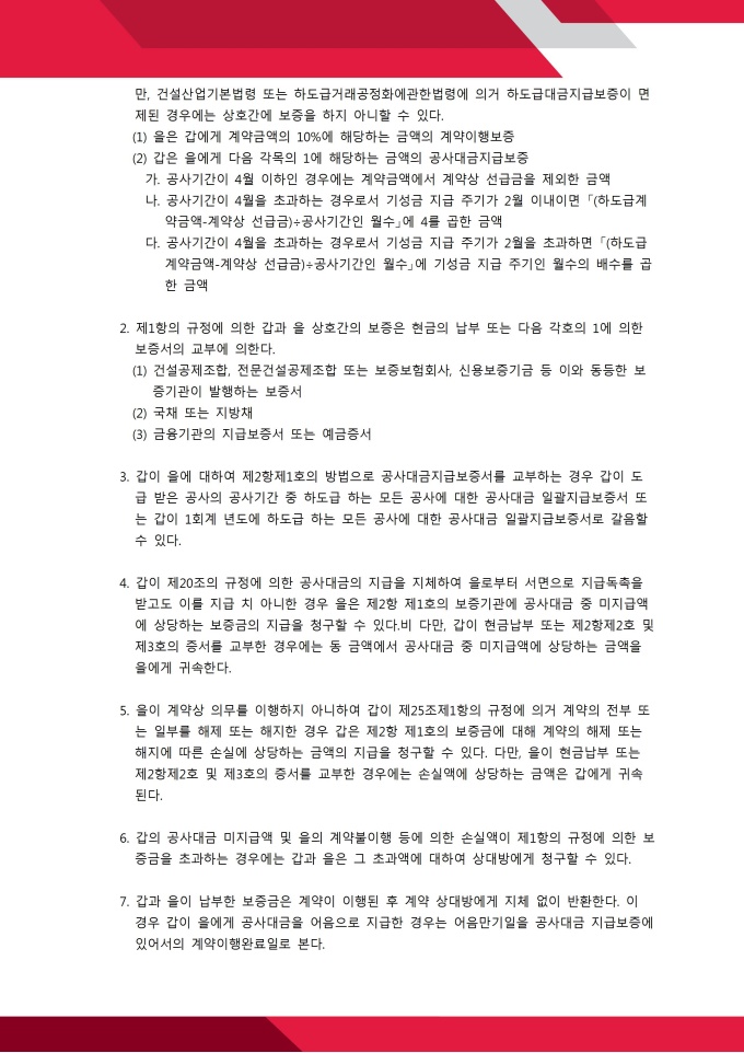 총칙, 계약보증, 보증인, 공사감독원 등 34개 조항으로 구성되어이쓴 건축공사표준계약서입니다.