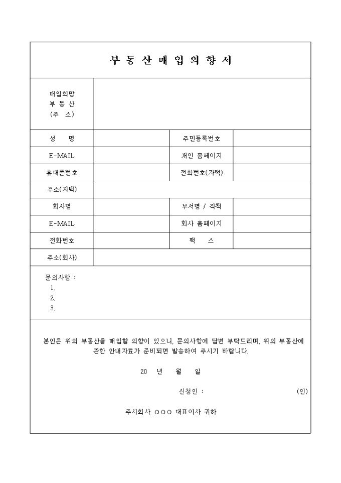 9,000원/월매입희망부동산, 성명, 주소, 회사명 등의 항목으로 구성되어있는 부동산매입의향서 양식입니다.