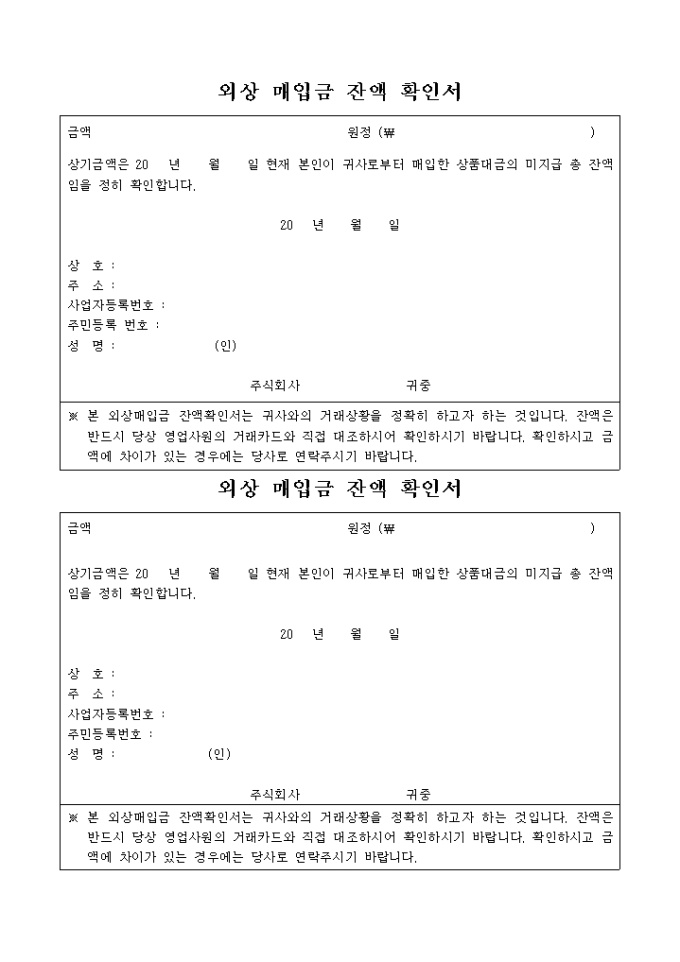 9,000원/월매입한 상품대금의 미지급 잔액임을 확인할 때 사용하는 입금확인서 양식입니다.