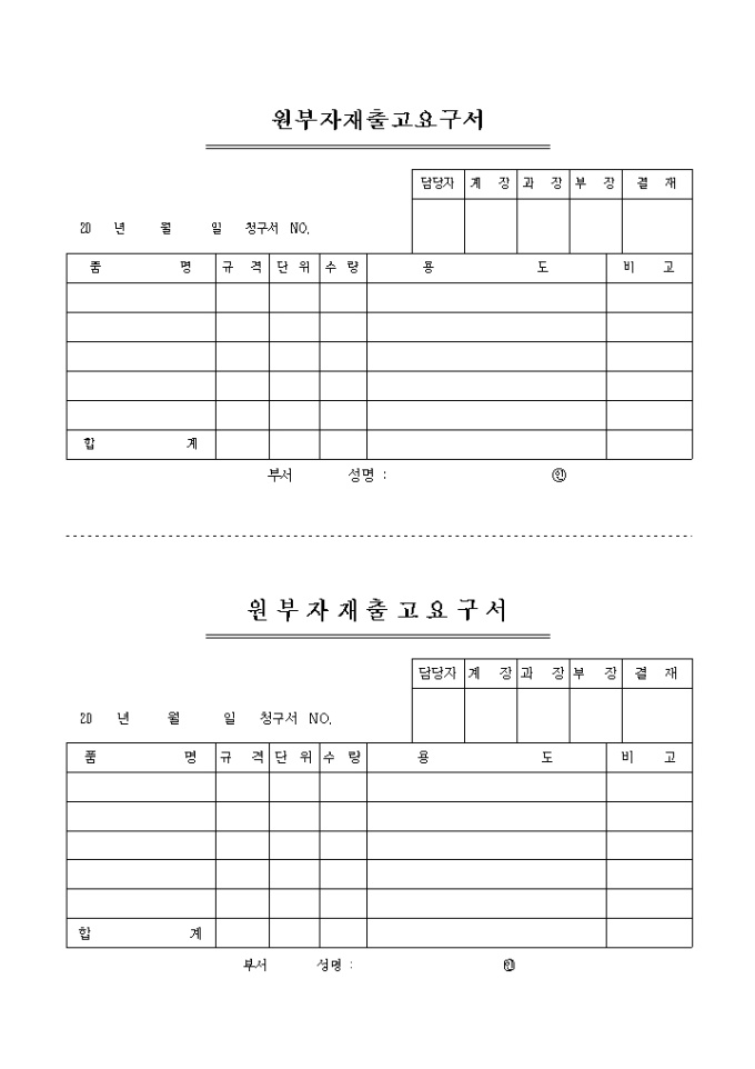 항목으로 품명, 규격, 단위, 수량, 용도가 있고 2장으로 연결된 원부자재출고요구서입니다.