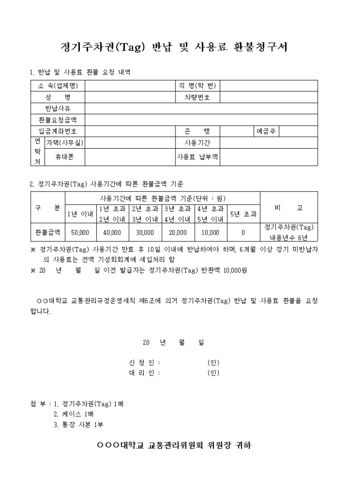 9,000원/월반납 및 사용료 환불 요청 내역, 정기주차권 사용기간에 따른 환불금액 기준 등의 항목으로 구성되어있는 정기주차권 반납 및 사용료 환불청구서입니다.
