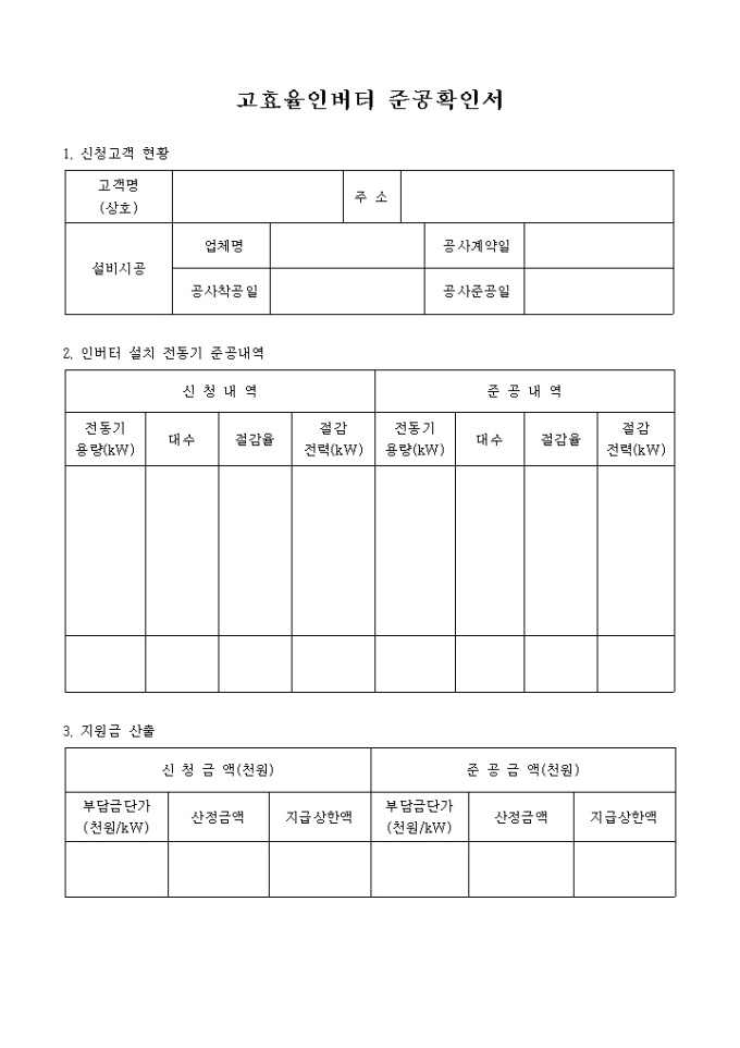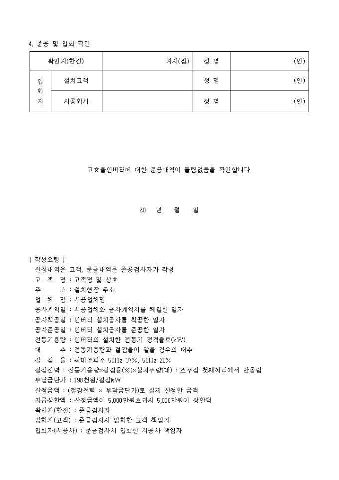 9,000원/월신청고객현황, 인버터 설치 전동기 준공내역 등의 항목으로 구성되어있는 준공확인서입니다.
