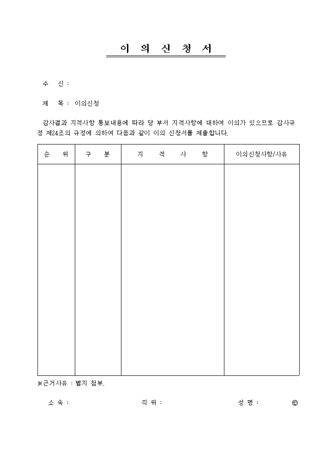 9,000원/월감사결과 지적사항에 대한 이의를 제기하는 이의신청서입니다.