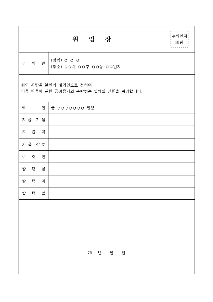 9,000원/월수임인, 액면, 지급기일, 지급지 등의 항목으로 구성되어있는 공증위임장입니다.