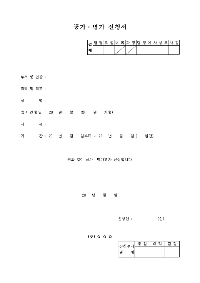 부서 및 업장, 직책 및 직무, 성명 등의 항목으로 구성되어있는 공가 및 병가신청서입니다.