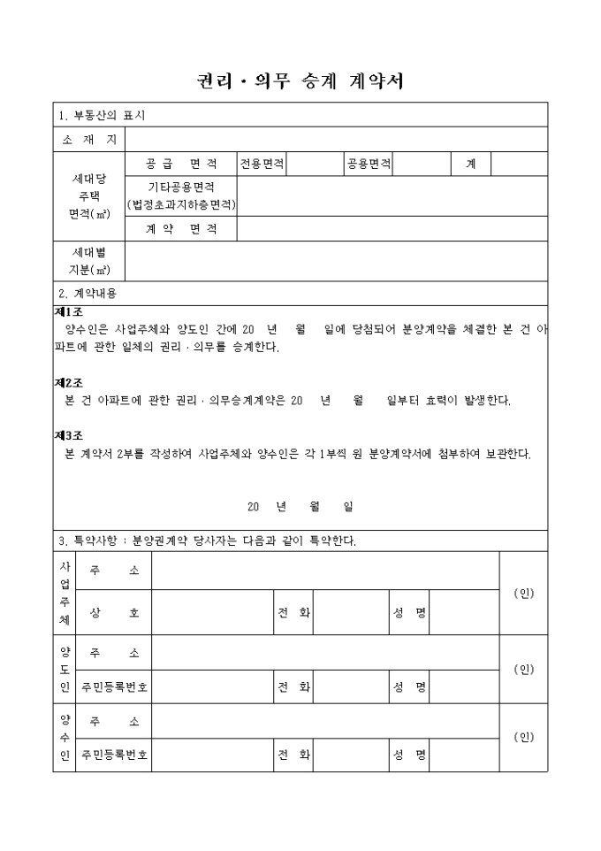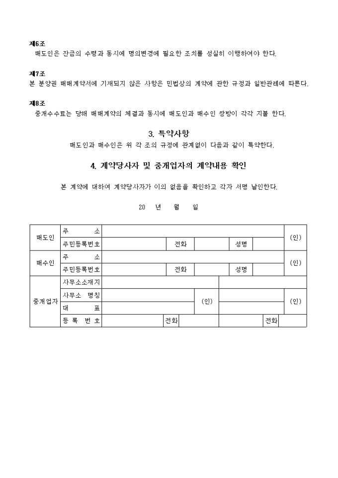 9,000원/월아파트 분양권의 표시, 계약내용, 특약사항 등의 항목으로 구성되어있는 분양권전매계약서입니다.