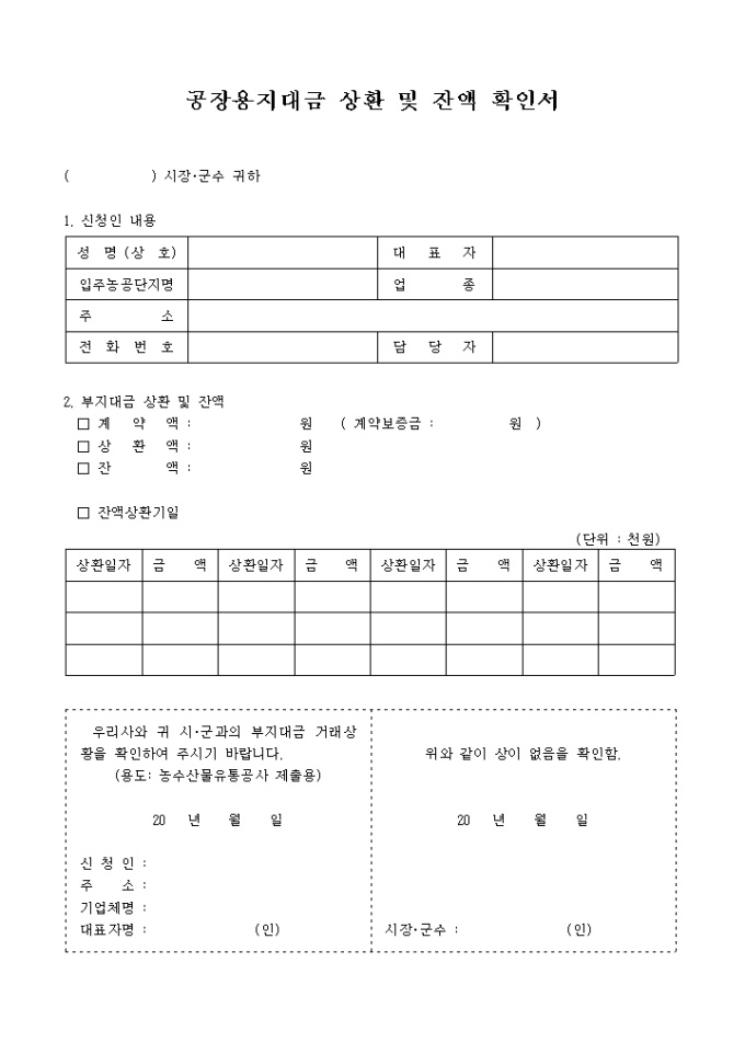 9,000원/월신청인 내용, 부지대금 상환 및 잔액 등의 항목으로 구성되어있는 공장용지대금 잔액확인서입니다.