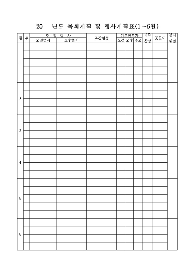 9,000원/월주일행사, 주간일정, 기도인도자 등의 항목으로 구성되어있는 목회계획 및 행사계획서입니다.