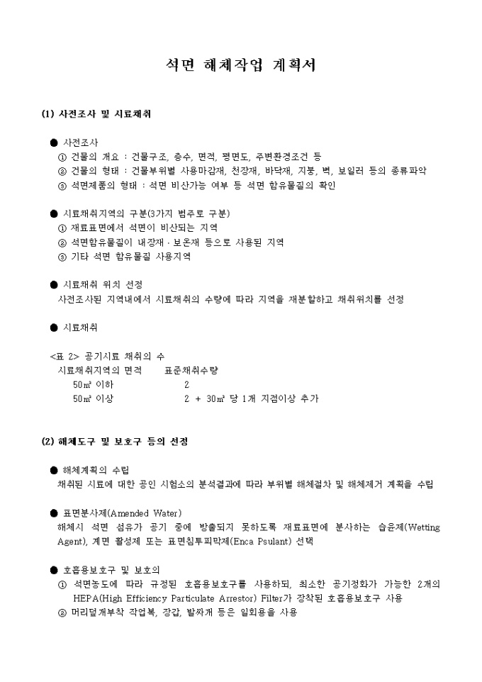 9,000원/월사전조사 및 시료채취, 해체도구 및 보호구 등의 선정, 공기측정계획 등의 항목으로 구성되어있는 석면 해체작업 계획서입니다.