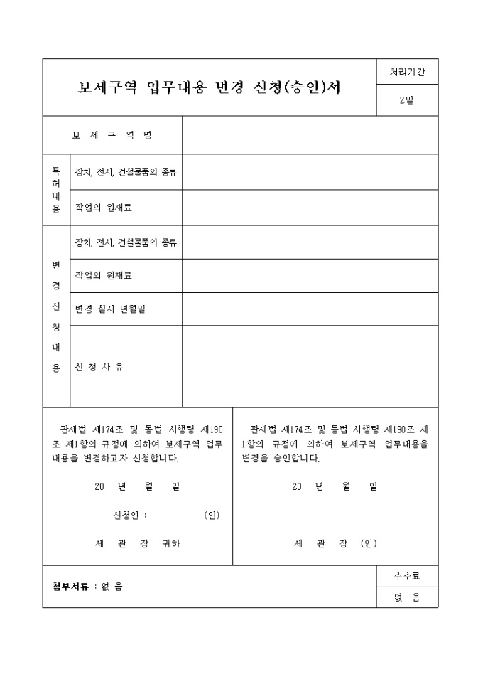 9,000원/월관세법 제174조 및 동법 시행령 제190조 제1항의 규정에 의하여 보세구역 업무내용을 변경하고자 할 때 사용하는 보세구역 업무내용 변경 신청(승인)서입니다.