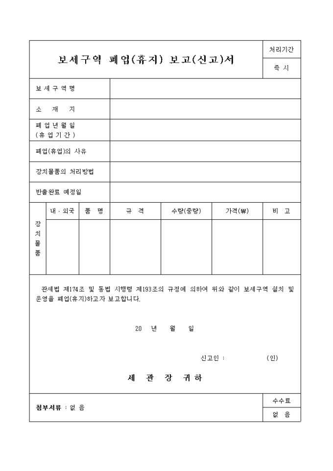 9,000원/월관세법 제174조 및 동법 시행령 제193조의 규정에 의하여 보세구역 설치 및 운영을 폐업(휴지)하고자 할 때 사용하는 보세구역 폐업(휴지) 보고(신고)서입니다.