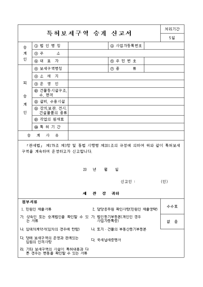 관세법 제179조 제3항 및 동법 시행령 제201조의 규정에 의하여 특허보세구역을 계속하여 운영하고자 신고할 때 사용하는 특허보세구역 승계신고서입니다.