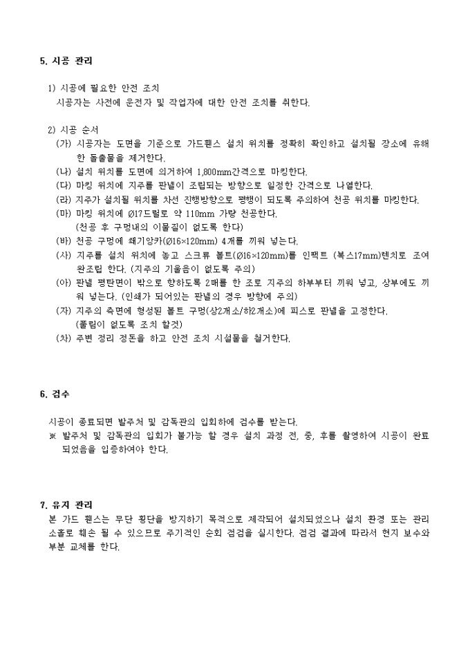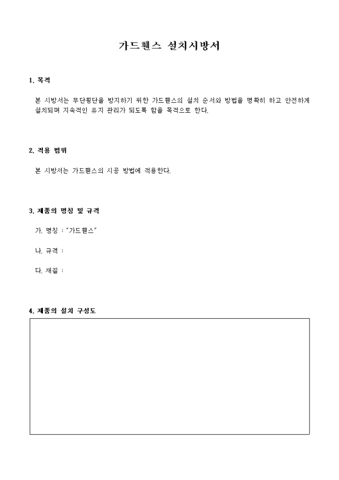 목적, 적용범위, 제품의 명칭 및 규격 등의 항목으로 구성되어있는 가드휀스 설치시방서입니다.