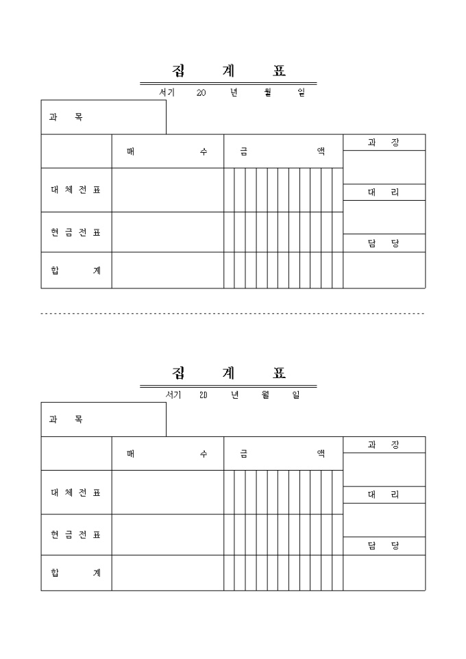 9,000원/월대체전표, 현금전표의 매수, 금액을 기입하는 집계표입니다.