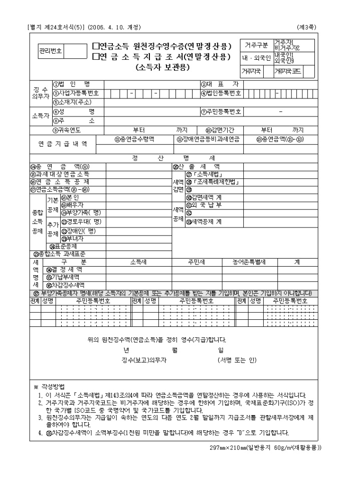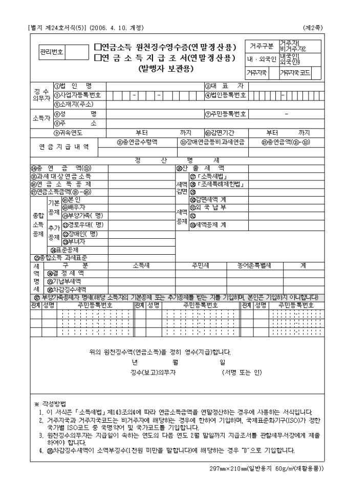 9,000원/월[2007년 연말정산]연금소득 원천징수영수증(연말정산용) 양식입니다.