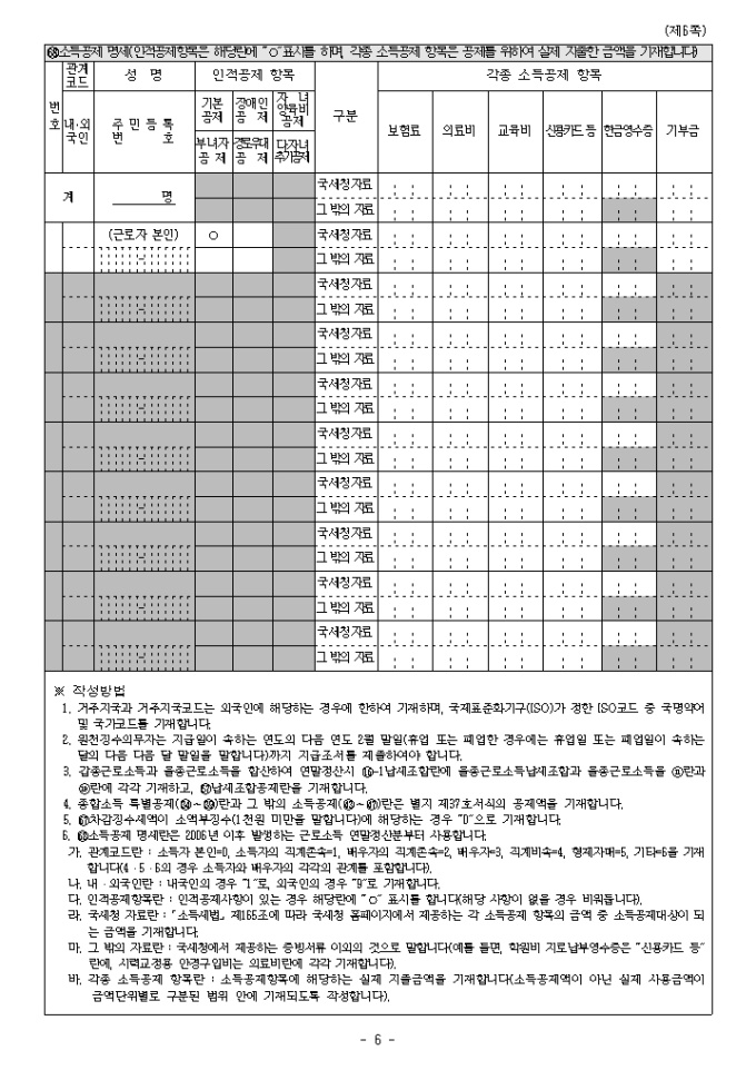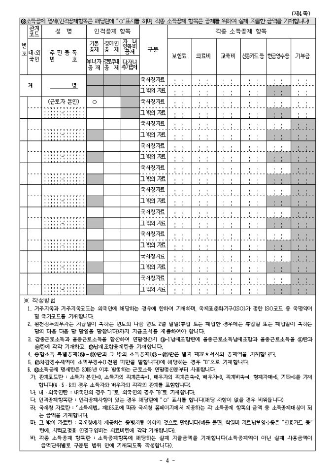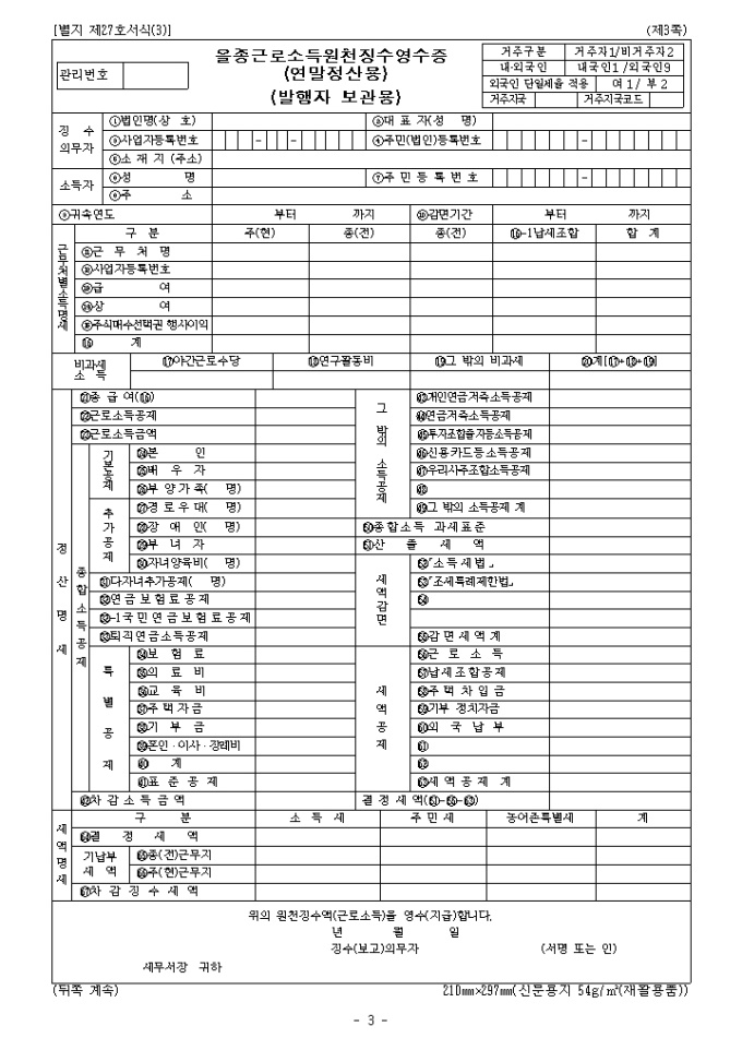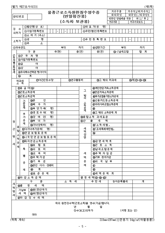 9,000원/월[2007년 연말정산]을종근로소득원천징수영수증(연말정산용) 양식입니다.