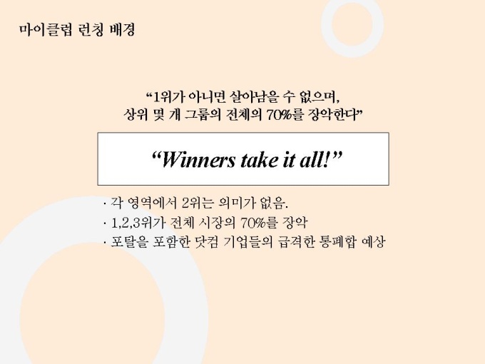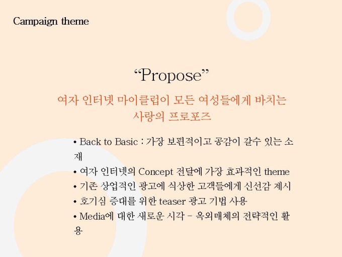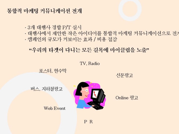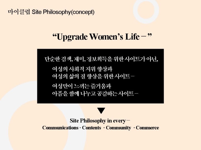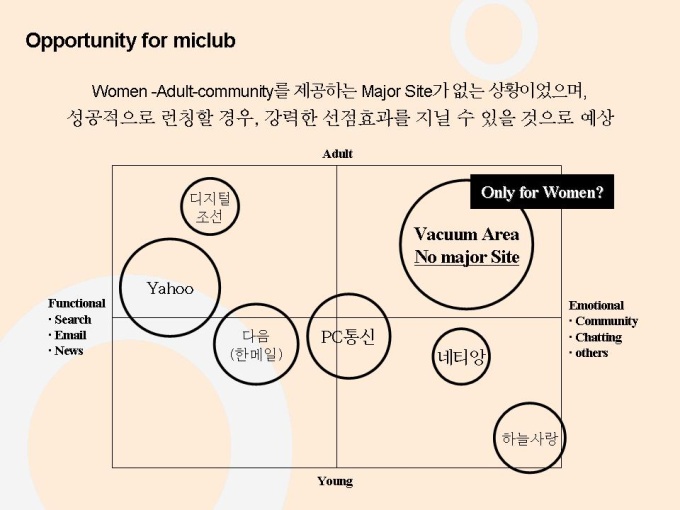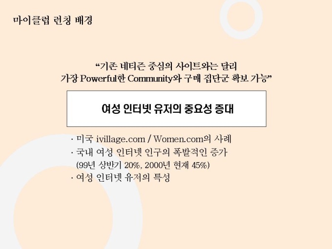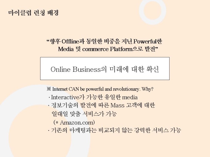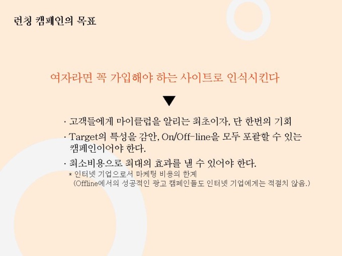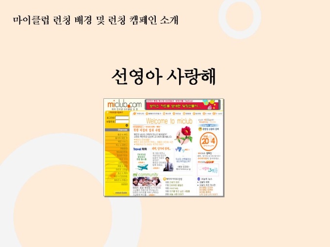 선영아 사랑해로 유명한 마이클럽 마케팅자료입니다. 파워포인트 1.23M 상반기 가장 많이 언론에 노출된 기업 Open 2개월만에 55만명 회원 유치, 350만 Pageview, 국내 최장의 Duration Time 28분 기록 Open 2개월만에 여성 포탈 1위 차지 11개 일간지 ‘2000년 상반기 히트상품’ 선정 7