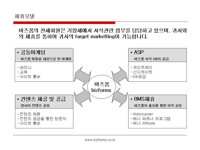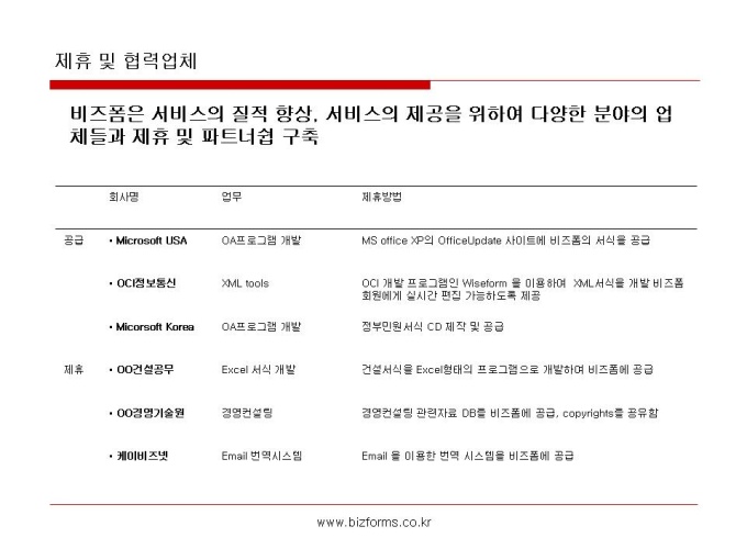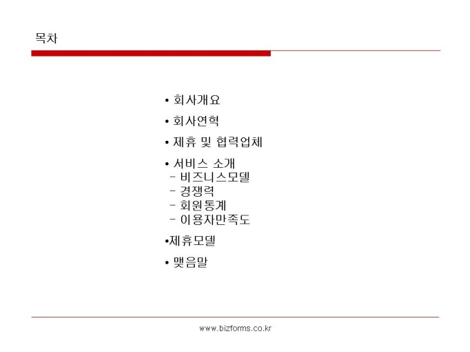 비즈폼소개서 입니다. [목 차] 1. 회사개요 2. 회사연혁 3. 제휴 및 협력업체 4. 서비스 소개 - 비즈니스모델 - 경쟁력 - 회원통계 - 이용자만족도 5. 제휴모델 6. 맺음말