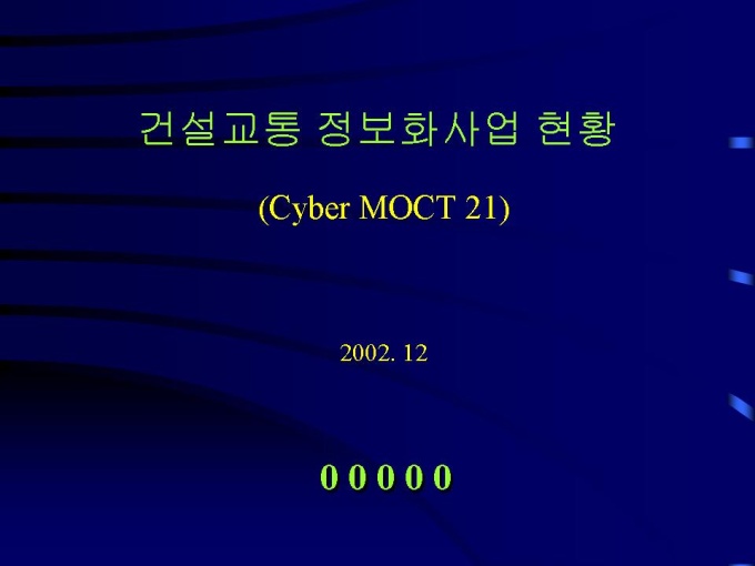 2003년 건설교통 정보화사업 현황 정보화 추진계획 사업계획서(건설교통부) 예제 양식입니다. 1.건설교통부 정보화 추진방향 2.행정정보화(Cyber MOCT) 사업 3.사회간접자본(soc)정보화 4.건설교통정보화 발전 구상