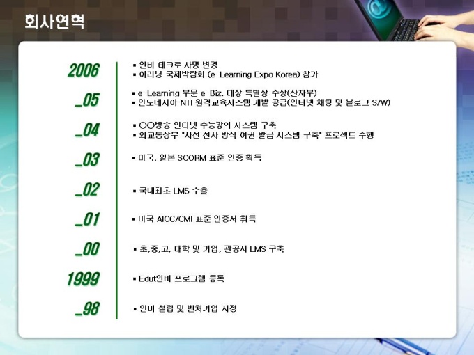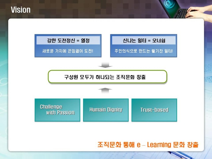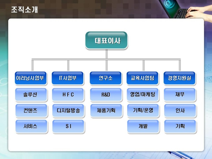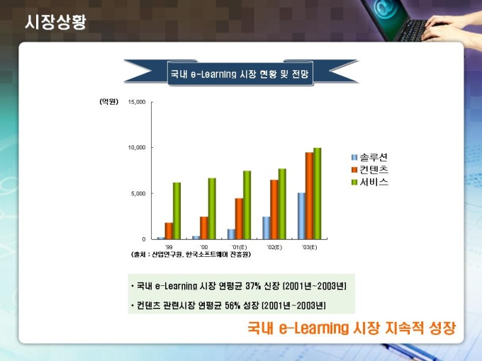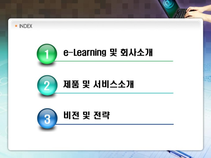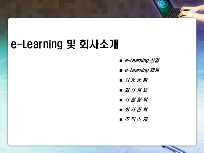인터넷교육 e-Learning 사업계획서입니다. 목차는 1.e-Learning 및 회사소개 2.제품 및 서비스소개 3.비전 및 전략 입니다.