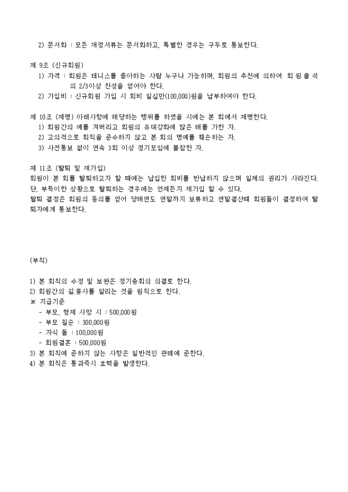 친목도모회의 회칙양식입니다. 명칭, 목적, 회원, 회원선거, 임기등의 총 11조항의 항목으로 구성되어 있습니다.