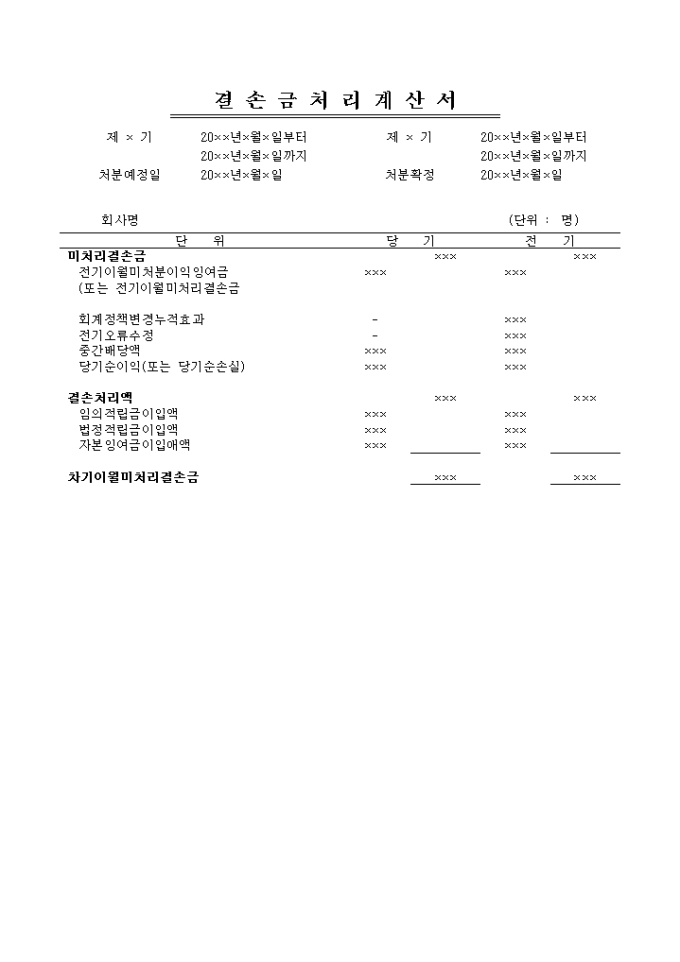 기업회계기준서에 의해 작성된 결손금처리계산서 양식입니다.