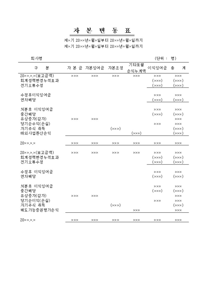 9,000원/월기업회계기준서에 의해 작성된 자동변동표 양식입니다.