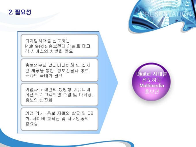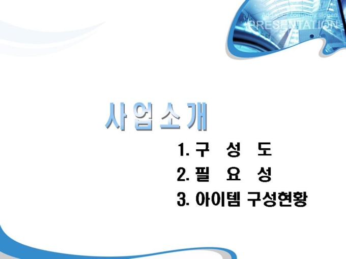 <목차> 1. 회사소개 1-1 멀티미디어 홍보관 1-2 회사개요 1-3 회사연혁 2. 사업소개 2-1 구성도 2-2 필요성 2-3 아이템 구성현황 3. 사업효과 3-1 도입에 따른 변화 3-2 기대효과 4. 예산안