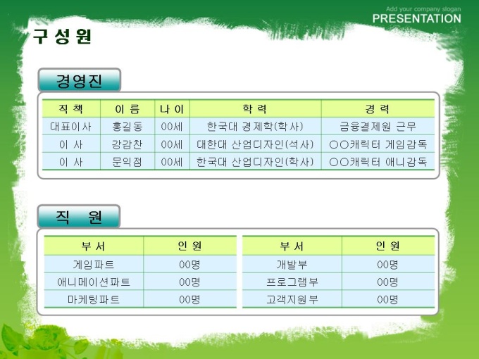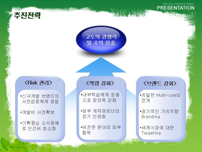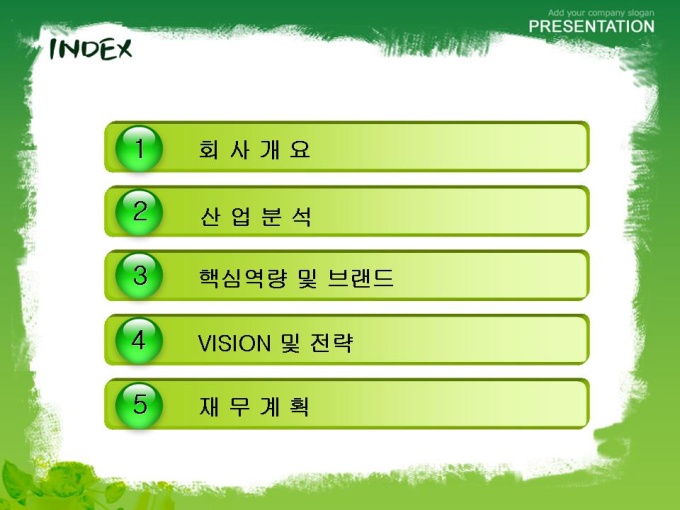 <목차> 1. 회사개요 1-1 연혁 1-2 조직도 1-3 구성원 2. 산업분석 2-1 사업영억 2-2 시장규모 3. 핵심역량 및 브랜드 3-1 핵심역량 3-2 브랜드1 3-3 브랜드2 3-4 브랜드 개발계획 4. VISION 및 전략 4-1 VISION 4-2 추진전략 5. 재무계획 5-1 매출 및 목표 5-2 매출사례 비교 5-3 손익계산서 5-4 대차대조표