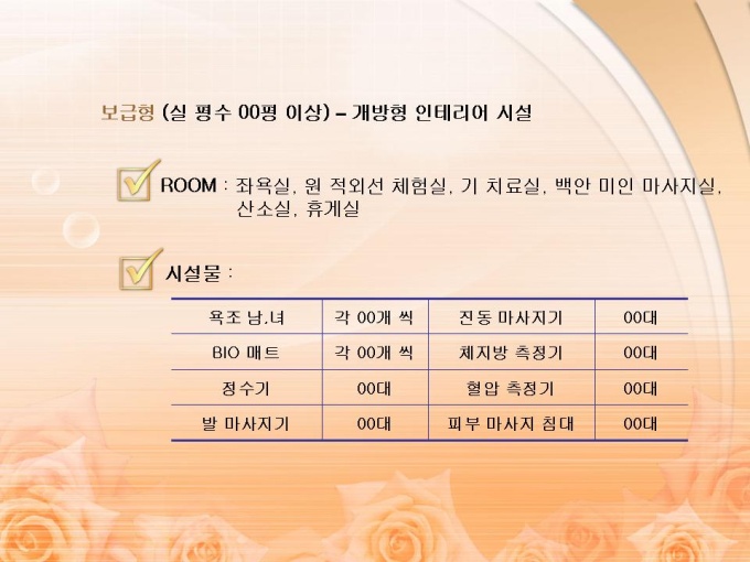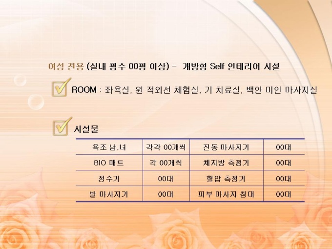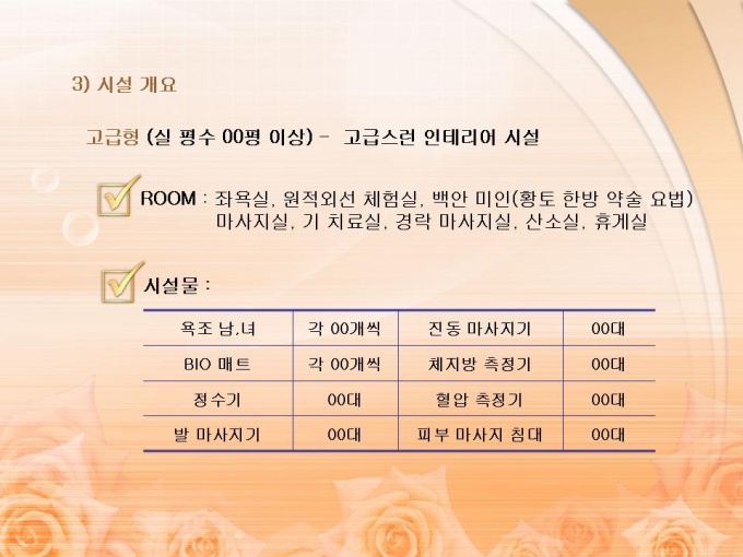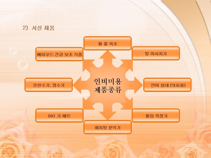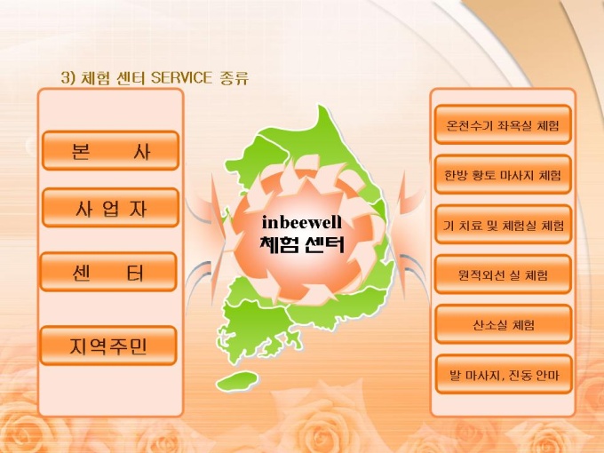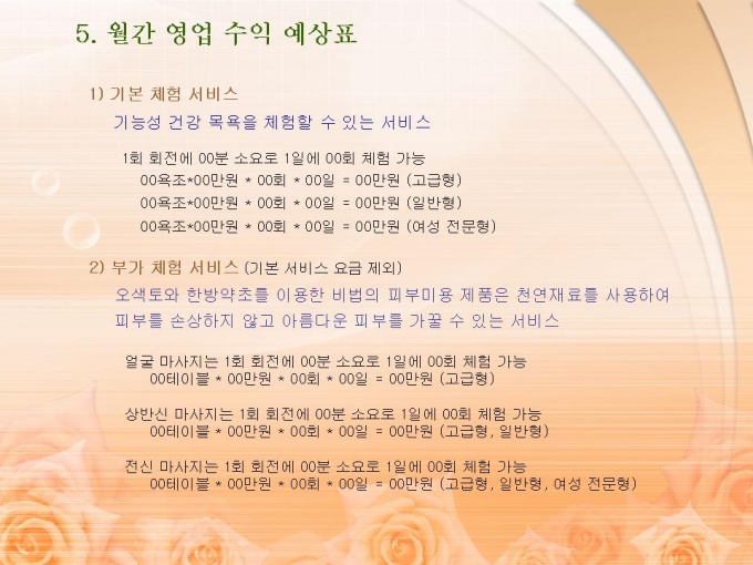 <목차> 1. 프랜차이즈의 개념 및 시설 제품 1-1 개념 1-2 시설 제품 2. 유사 시장의 분석 2-1 피부 마사지 및 다이어트 시장 현황 및 매출 규모 2-2 건강 보조 식품 시장 현황 및 매출 규모 3. 사업의 비젼 3-1 사업의 비젼 3-2 사업의 전략 3-3 사업의 기대 효과 4. 프랜차이즈 관리 운영 계획 4-1 홍보 영업 계획 4-2 관리자 및 직원 교육 계획 4-3 체험센터 SERVICE 종류 4-4 파동 의학 4-5 기능성 온천수기의 특징 5. 월간 영업 수익 예상표 5-1 기본 체험 서비스 5-2 부가 체험 서비스 5-3 예상 수익표 6. 사업 추진 일정 및 시설 개요 6-1 추진 일정 6-2 시설 개요