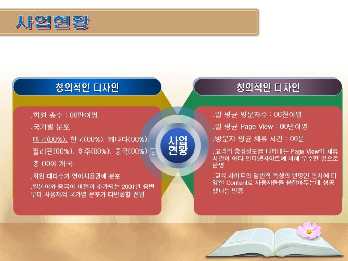 <목차> 1. 사업개요 2. 사업환경 및 필요성 3. 시장분석 4. 사업내용/추진주체 5. 사이트구성 6. 사이트특성 7. 경쟁업체 비교분석 8. 교육프로그램 구성 9. 마케팅 전략 10. 예상 가입회원수 11. 예상매출액 추이 12. 사업현황 13. 비용분석 14. 사업일정 15. 중장기 플랜
