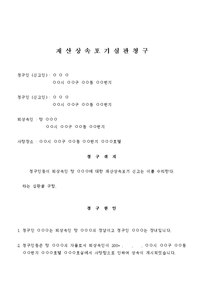 청구인등은 민법 제1019조에 의하여 재산 상속을 포기하고자 하여 이건 청구에 이른 것입니다.