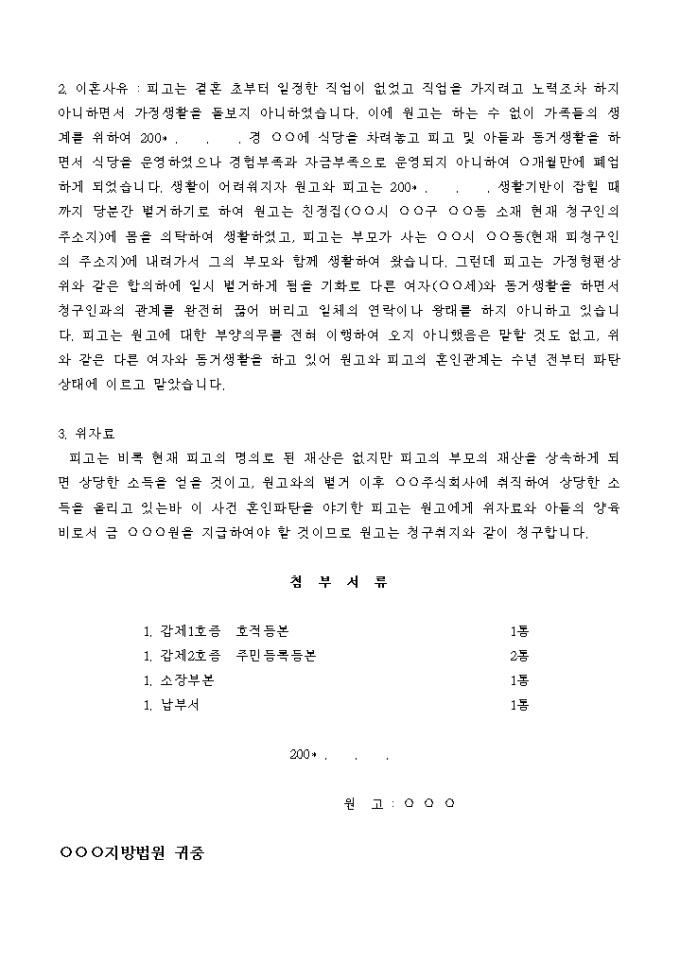 피고는 비록 현재 피고의 명의로 된 재산은 없지만 피고의 부모의 재산을 상속하게 되면 상당한 소득을 얻을 것이고, 원고와의 별거 이후 ○○주식회사에 취직하여 상당한 소득을 올리고 있는바 이 사건 혼인파탄을 야기한 피고는 원고에게 위자료와 아들의 양육비로서 금 ○○○원을 지급하여야 할 것이므로 원고는 청구취지와 같이 청구합니다.