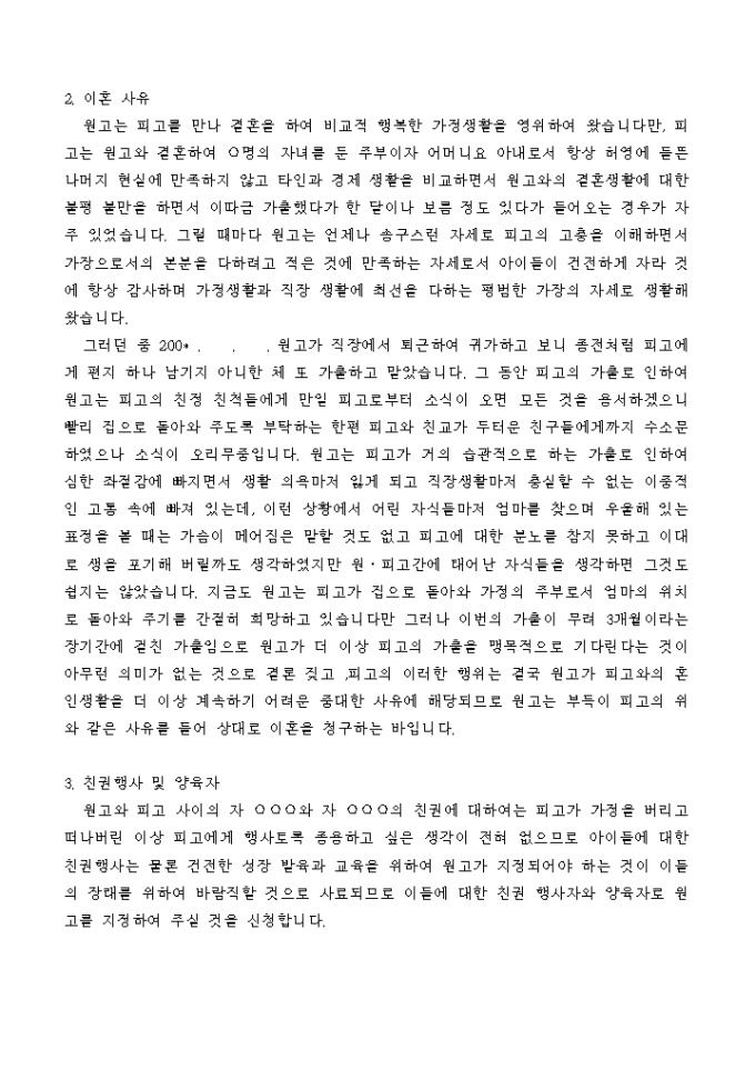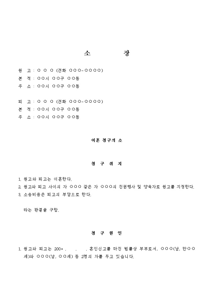 9,000원/월원고와 피고는 이혼한다. 원고와 피고 사이의 자 ○○○ 같은 자 ○○○의 친권행사 및 양육자로 원고를 지정한다. 소송비용은 피고의 부담으로 한다. 라는 판결을 구함.