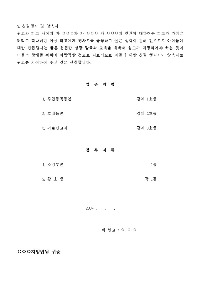 원고와 피고 사이의 자 ○○○와 자 ○○○ 자 ○○○의 친권에 대하여는 피고가 가정을 버리고 떠나버린 이상 피고에게 행사토록 종용하고 싶은 생각이 전혀 없으므로 아이들에 대한 친권행사는 물론 건전한 성장 발육과 교육을 위하여 원고가 지정되어야 하는 것이 이들의 장래를 위하여 바람직할 것으로 사료되므로 이들에 대한 친권 행사자와 양육자로 원고를 지정하여 주실 것을 신청합니다.