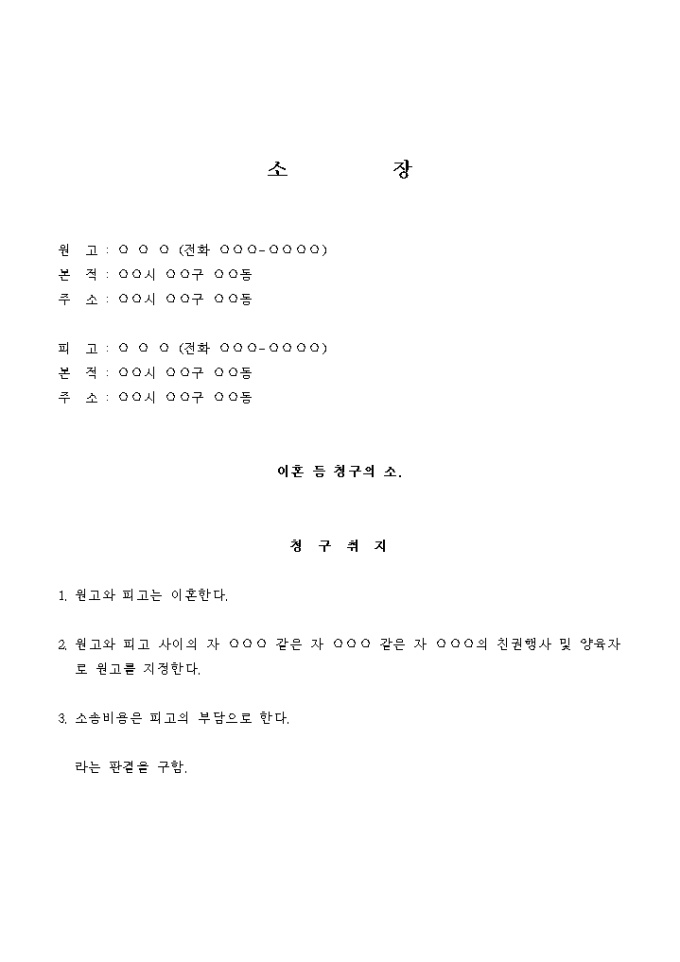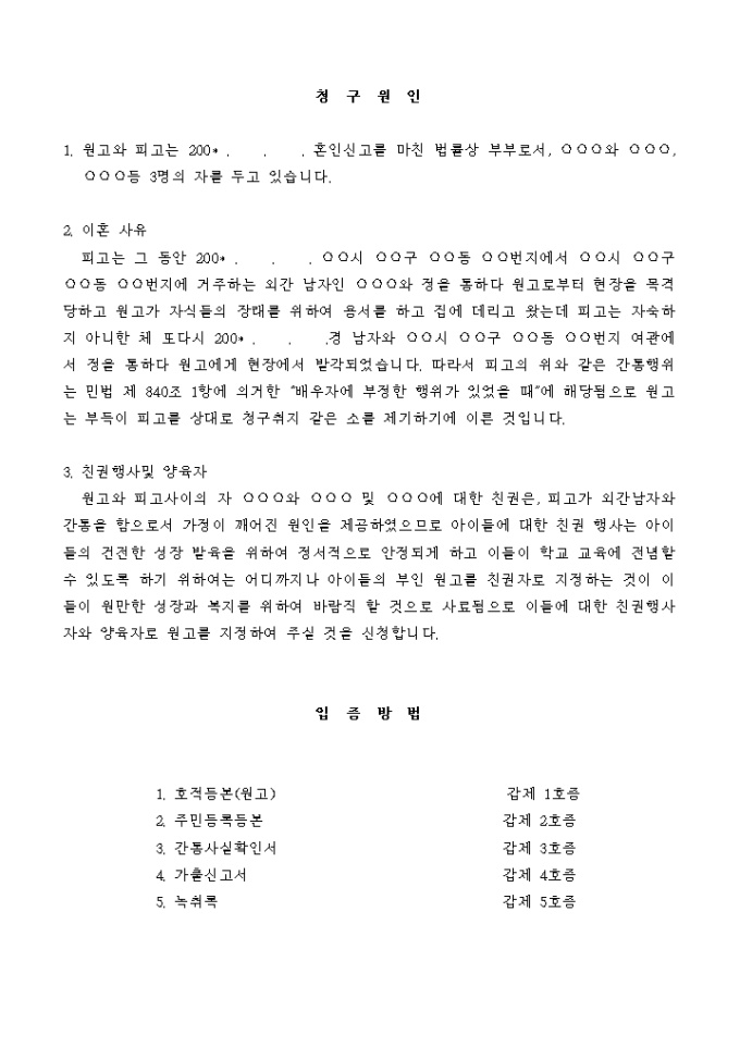 9,000원/월원고와 피고사이의 자 ○○○와 ○○○ 및 ○○○에 대한 친권은, 피고가 외간남자와 간통을 함으로서 가정이 깨어진 원인을 제공하였으므로 이들에 대한 친권행사자와 양육자로 원고를 지정하여 주실 을 신청합니다.