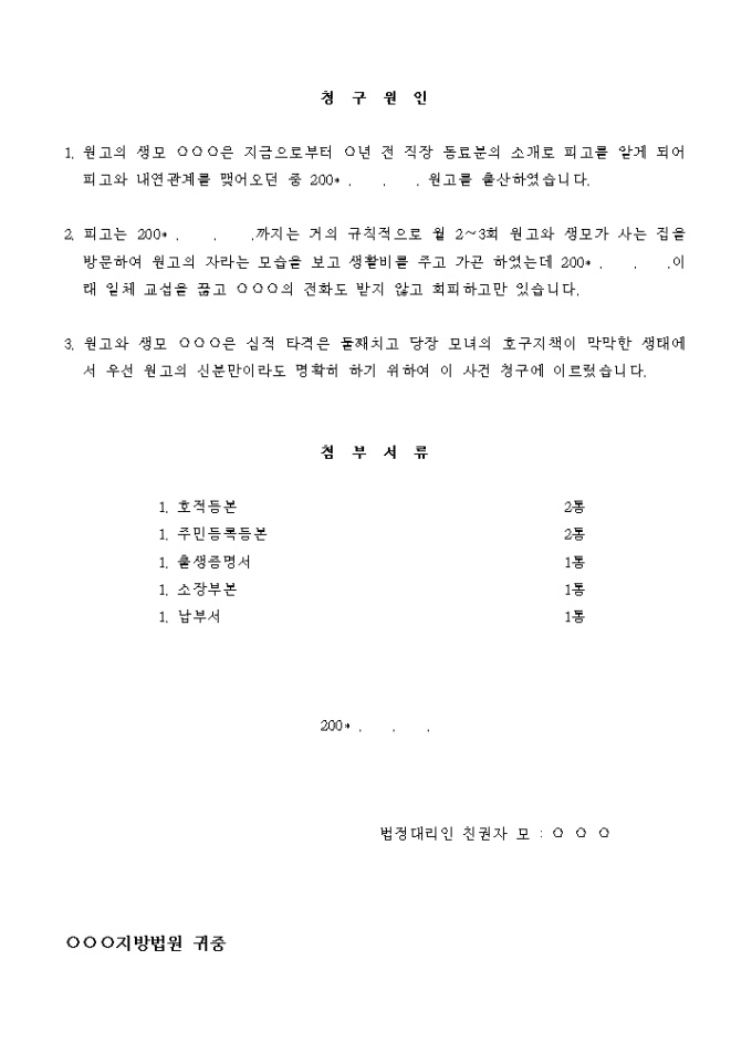 원고와 생모 ○○○은 심적 타격은 둘째치고 당장 모녀의 호구지책이 막막한 생태에서 우선 원고의 신분만이라도 명확히 하기 위하여 이 사건 청구에 이르렀습니다.