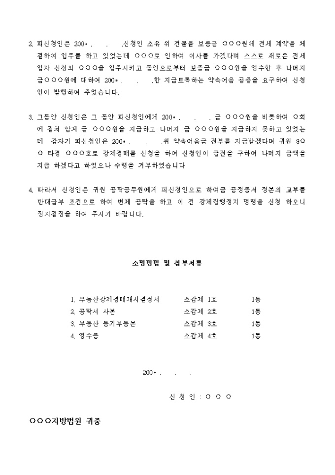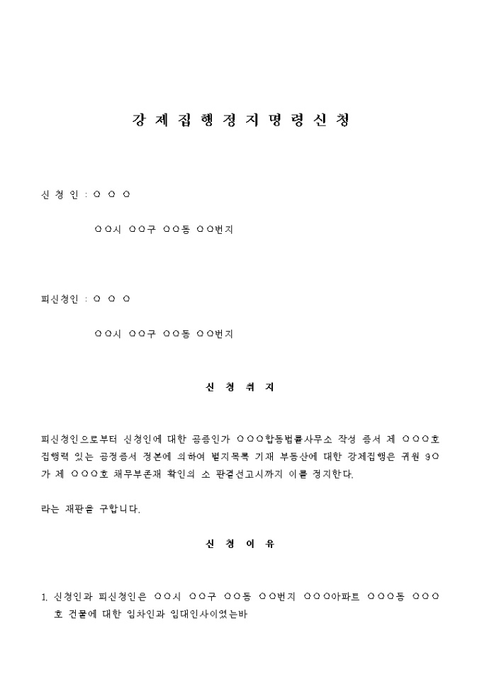 피신청인으로부터 신청인에 대한 공증인가 ○○○합동법률사무소 작성 증서 제 ○○○호 집행력 있는 공정증서 정본에 의하여 별지목록 기재 부동산에 대한 강제집행은 귀원 9○ 가 제 ○○○호 채무부존재 확인의 소 판결선고시까지 이를 정지한다.