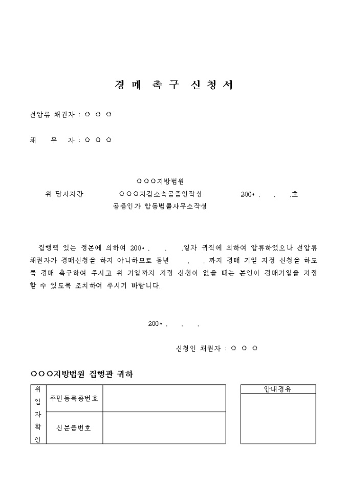 9,000원/월집행력 있는 정본에 의하여 200* . . .일자 귀직에 의하여 압류하였으나 선압류 채권자가 경매신청을 하지 아니하므로 동년 . . 까지 경매 기일 지정 신청을 하도록 경매 촉구하여 주시고 위 기일까지 지정 신청이 없을 때는 본인이 경매기일을 지정 할 수 있도록 조치하여 주시기 바랍니다.