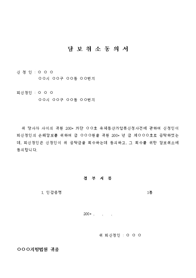 9,000원/월위 당사자 사이의 귀원 200* 카단 ○○호 유체동산가압류신청사건에 관하여 신청인이 피신청인의 손해담보를 위하여 금 ○○○원을 귀원 200* 년 금 제○○○호로 공탁하였는데, 피신청인은 신청인이 위 공탁금을 회수하는데 동의하고, 그 회수를 위한 담보취소에 동의합니다.