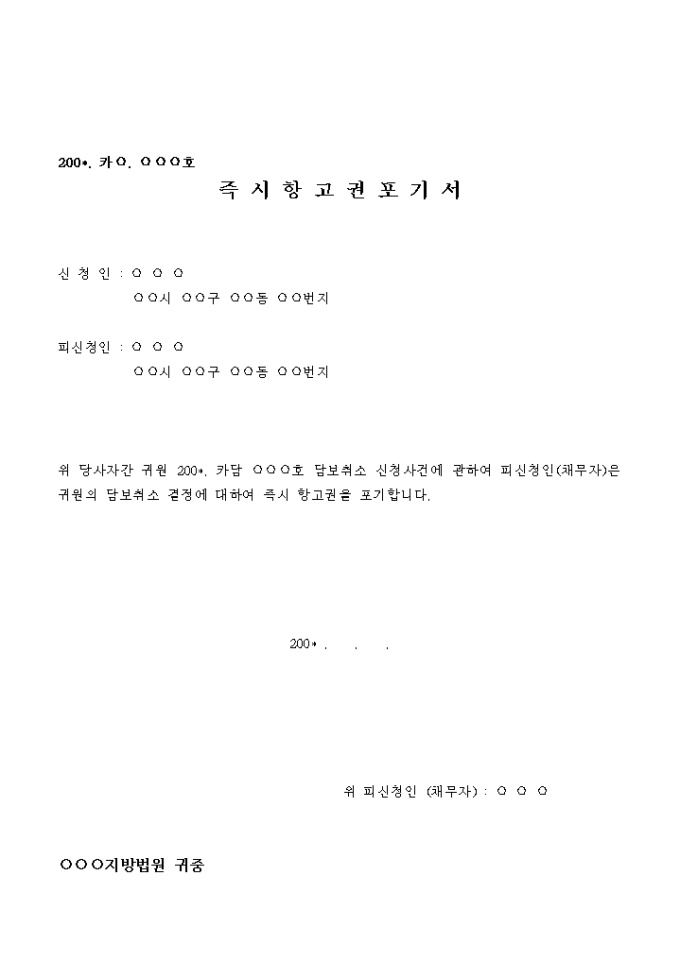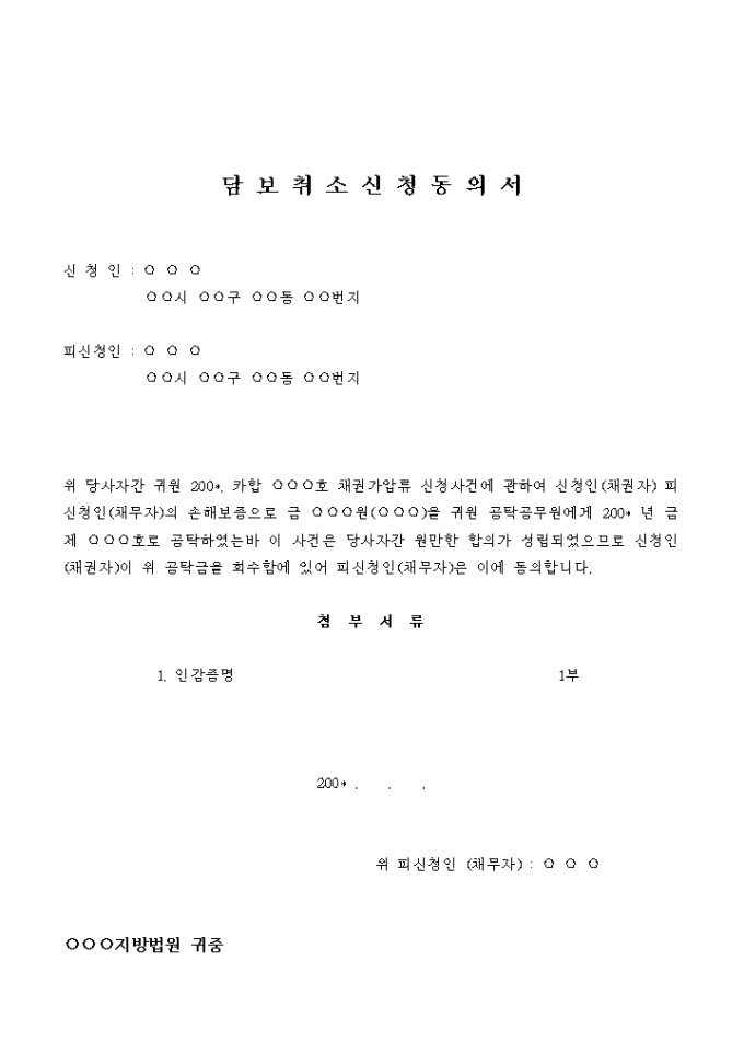 위 당사자간 귀원 200*. 카합 .○○○호 채권가압류 신청사건에 관하여 신청인은 피신청인에 대한 손해담보로 200* . . . 귀원 공탁공무원에게 200* 년 금제 ○○○호로 금 ○○○ (○○○원)을 공탁하였는바 그 후 당사자간 원만한 합의가 성립되었고 이에 따라 담보권자인 피신청인의 동의를 얻었으니 담보취소결정을 하여 주시기 바랍니다.