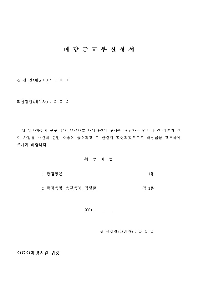 위 당사자간의 귀원 9○ .○○○호 배당사건에 관하여 채권자는 별지 판결 정본과 같이 가압류 사건의 본안 소송이 승소되고 그 판결이 확정되었으므로 배당금을 교부하여 주시기 바랍니다.